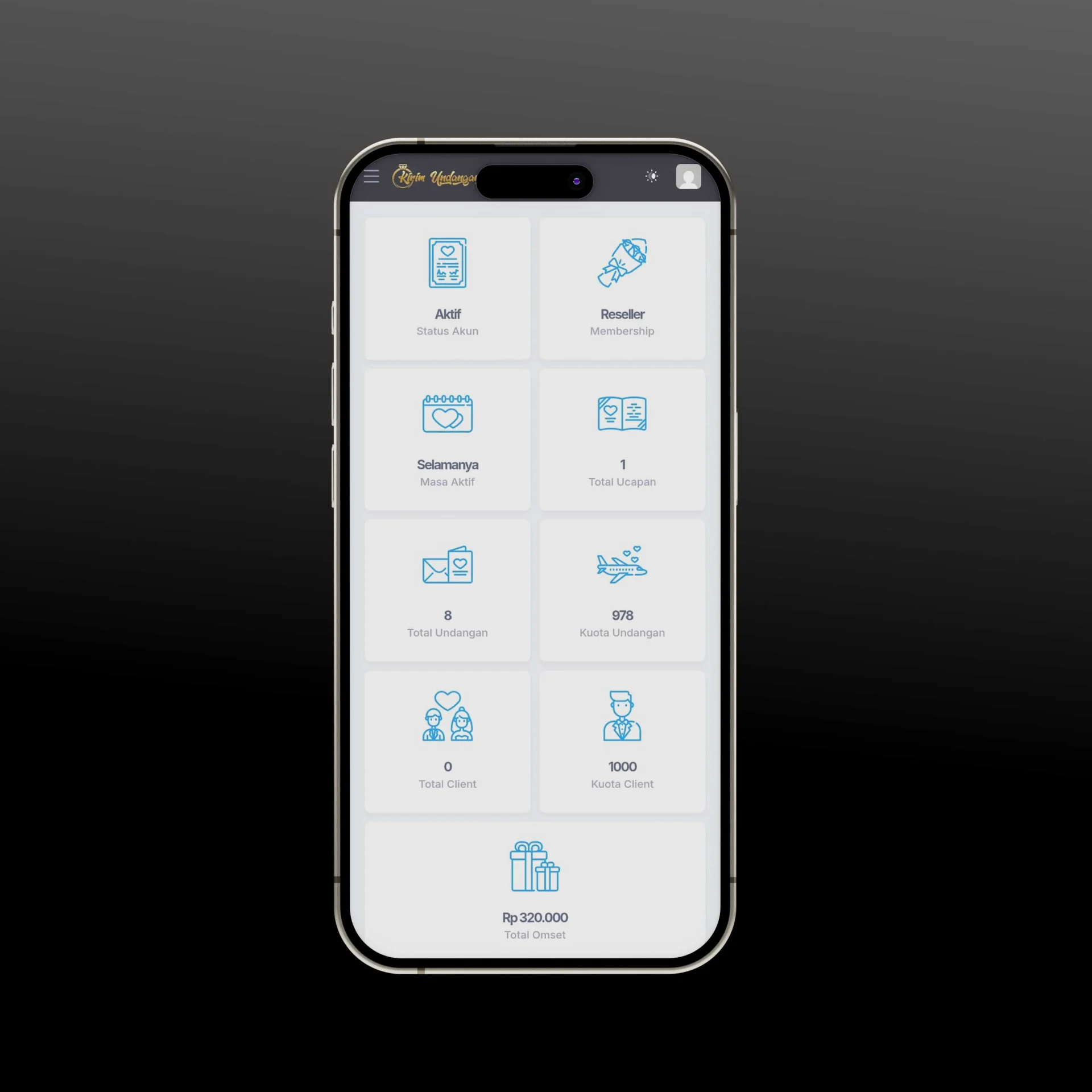 Pada dashboard undangan terdapat fitur tambahan untuk reseller yaitu kuota client, total client dan jumlah omset yang didapat dari pembuatan undangan dan mendaftarkan client.